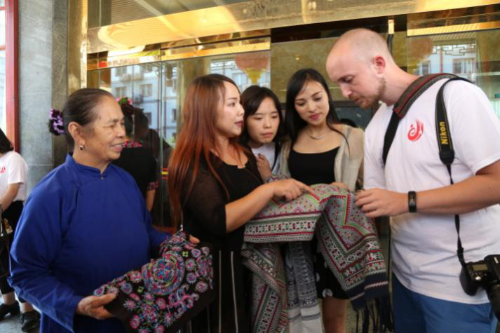 侗錦非遺傳承人石培云和呀啰耶侗錦公司總經(jīng)理歐瑞凡正在為記者展示侗錦 圖/中國青年報·中青在線記者 仵楠
