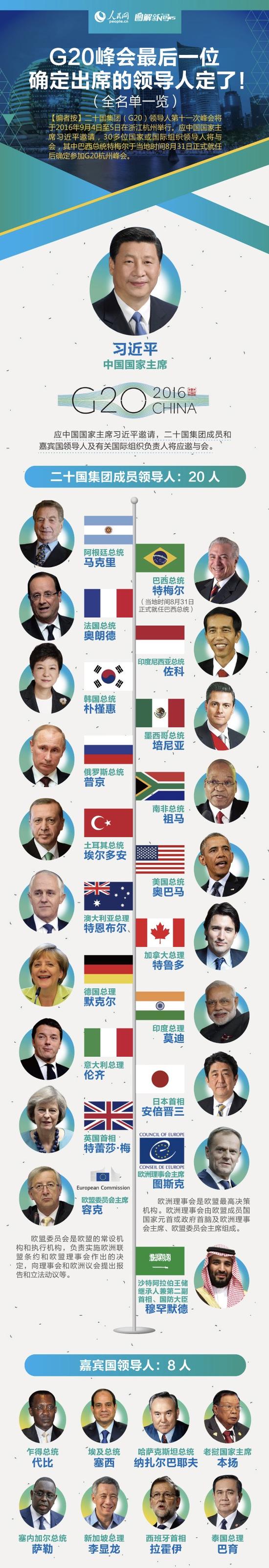 G20峰會(huì)將于9月4日至5日在浙江杭州舉行。應(yīng)中國國家主席習(xí)近平邀請(qǐng),30多位國家或國際組織領(lǐng)導(dǎo)人將與會(huì),其中巴西總統(tǒng)特梅爾于當(dāng)?shù)貢r(shí)間8月31日正式就任后確定參加G20杭州峰會(huì)。都有哪些重要人物?戳名單 一起看看吧~