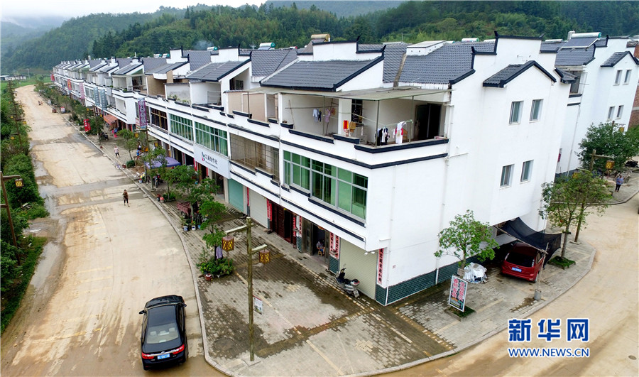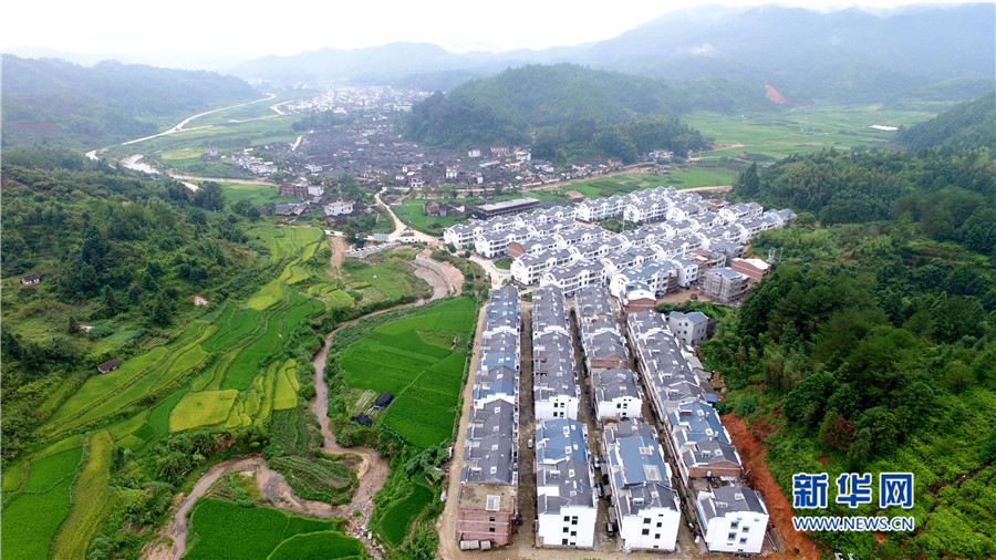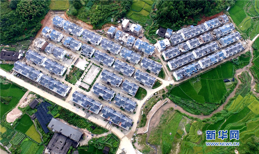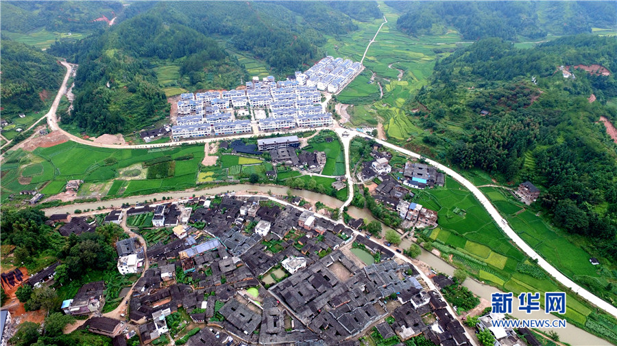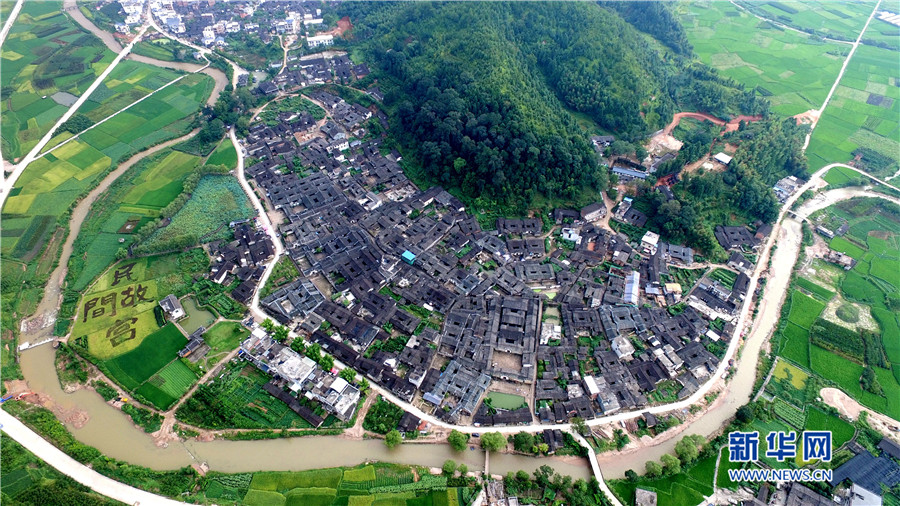 培田新村現(xiàn)規(guī)劃兩期,有住戶150戶,解決了當(dāng)?shù)匚奈锉Wo與村民改善居住條件需求的矛盾。圖為徽派風(fēng)格的培田新村別墅群俯拍圖。