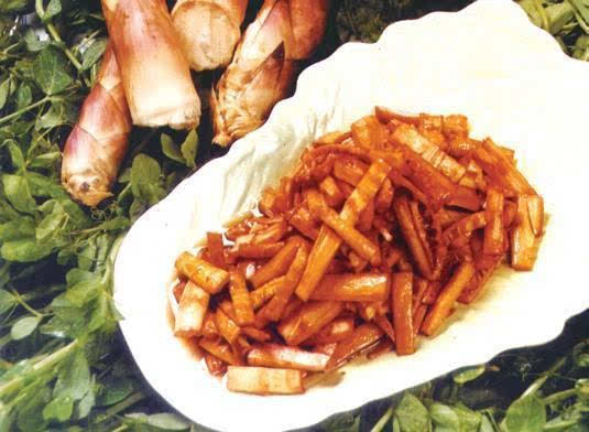 杭州《四時習俗》一書中記載說:“普通菜蔬均喜用筍。春夏之交食春筍,夏秋食邊筍……十月以后食冬筍,各種葷菜亦加筍為配料,可謂無日不筍,無食不筍!薄坝蜖F春筍”選用杭州近郊清明節(jié)前出土的嫩筍,以重油、重糖烹制,色澤紅亮,鮮嫩爽口,略帶甜味,百吃不厭,是頗受廣大食者歡迎的一道傳統(tǒng)風味菜。這道菜1956 年被浙江省認定為36 道杭州名菜之一。