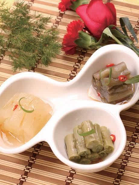 寧波“三臭”指的是臭冬瓜、臭莧菜梗、臭菜心(臭芋艿蓊),其最大特點是“聞聞是臭的,吃吃是香的”。寧波人食“臭”歷史悠久,清代范宣《越諺》的“莧菜!敝袑懙溃骸扒{見《易夫卦》,其梗如蔗段,腌之氣臭味佳,最下飯!薄叭簟敝谱髟砀B興的霉豆腐、霉千張、霉筍相似,但風味不一樣。