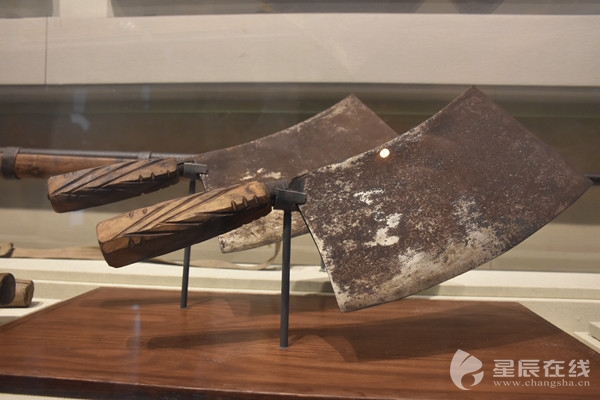 (賀龍“兩把菜刀鬧革命”的故事家喻戶曉。圖為紀(jì)念館內(nèi)收藏的賀龍率鄉(xiāng)鄰好友劈鹽務(wù)局用過的菜刀。)
