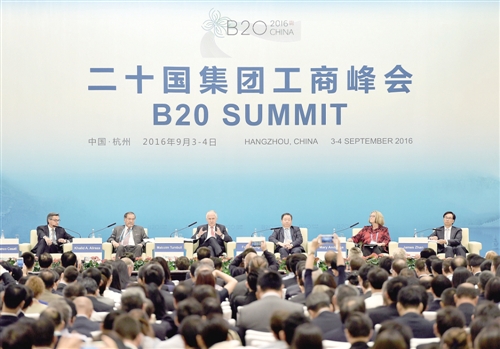 9月4日,澳大利亞總理特恩布爾(左三)在研討會(huì)上發(fā)言。當(dāng)日,二十國(guó)集團(tuán)工商峰會(huì)在浙江杭州舉辦“實(shí)現(xiàn)強(qiáng)勁的國(guó)際貿(mào)易和投資”專(zhuān)題研討。 新華社記者 李 鑫攝