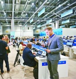 圖②:9月4日,媒體記者在新聞中心觀看二十國集團領(lǐng)導(dǎo)人杭州峰會開幕的直播畫面。新華社發(fā)