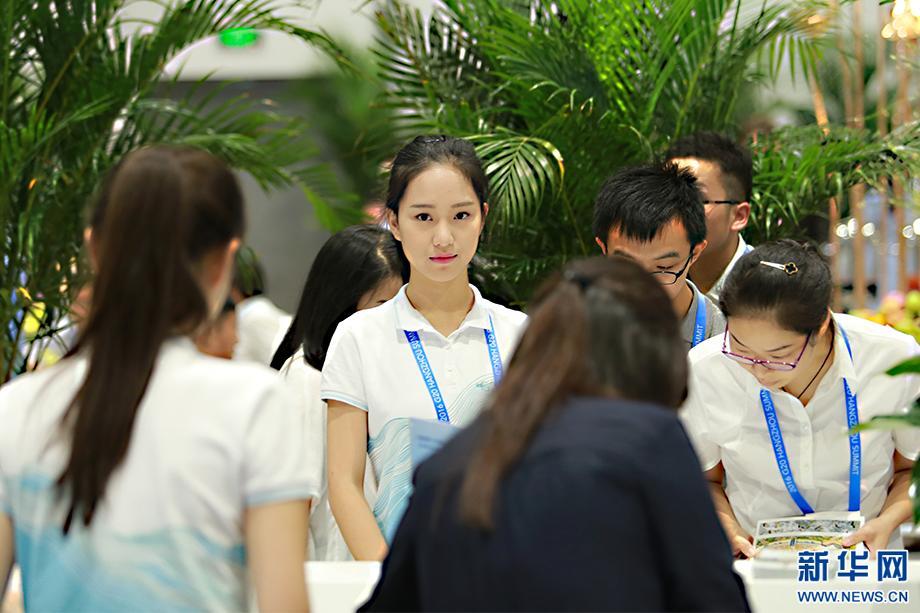 9月4日至5日,二十國集團(tuán)領(lǐng)導(dǎo)人杭州峰會在浙江杭州舉行。全球媒體人匯聚一堂,關(guān)注報道峰會盛況。在G20杭州峰會新聞中心,200多位志愿者身著青白色運動服,男生外套上藍(lán)下白,象征層巒疊嶂;女生外套上白下藍(lán),意味水波蕩漾。兩者輝映,體現(xiàn)了杭州這座古城湖光山色的獨特風(fēng)韻!靶∏嗪伞笔谴舜畏鍟驹刚叩拇~。這個名字取自宋代詩人楊萬里描寫杭州的詩句“接天蓮葉無窮碧,映日荷花別樣紅”,“青荷”也音同“親和”,他們成了G20杭州峰會新聞中心里一道亮麗的風(fēng)景。新華網(wǎng) 祝立銘 攝 圖片來源:新華網(wǎng)