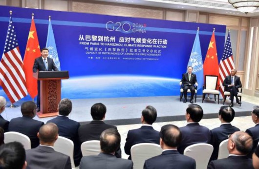 9月3日17時(shí)30分許,杭州西湖國(guó)賓館如意廳,中美兩國(guó)元首先后向聯(lián)合國(guó)秘書長(zhǎng)潘基文交存氣候變化《巴黎協(xié)定》批準(zhǔn)文書。
