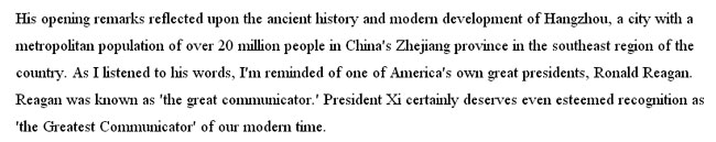 習主席在開幕詞中,回顧了杭州悠久的歷史,談到了杭州的現(xiàn)代發(fā)展。聽他致辭時,我想起了一位偉大的美國總統(tǒng)——羅納德 里根(Ronald Reagan)。里根總統(tǒng)被譽為“偉大的溝通者”。而習主席完全稱得上是我們當代“最偉大的溝通者”。