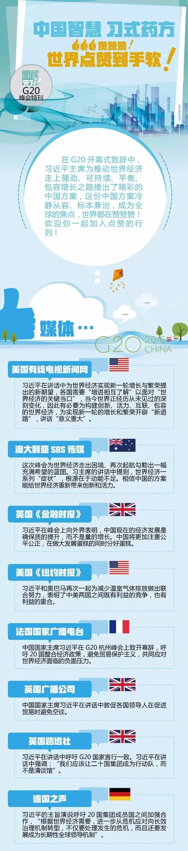 在G20開幕式致辭中,習(xí)近平主席為推動世界經(jīng)濟(jì)走上強(qiáng)勁、可持續(xù)、平衡、包容增長之路提出了精彩的中國方案,這份中國方案冷靜從容、標(biāo)本兼治,成為全球的焦點(diǎn),世界都在贊贊贊!歡迎你一起加入點(diǎn)贊的行列!