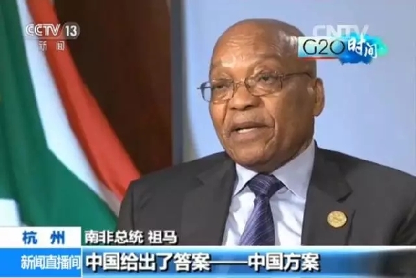 南非總統(tǒng)祖馬表示,作為非洲國家的代表,他很贊同G20杭州峰會(huì)上習(xí)主席提出的全球治理的中國方案,他認(rèn)為這不僅會(huì)促進(jìn)非洲經(jīng)濟(jì)的增長(zhǎng),也為全球經(jīng)濟(jì)增長(zhǎng)做出貢獻(xiàn)。