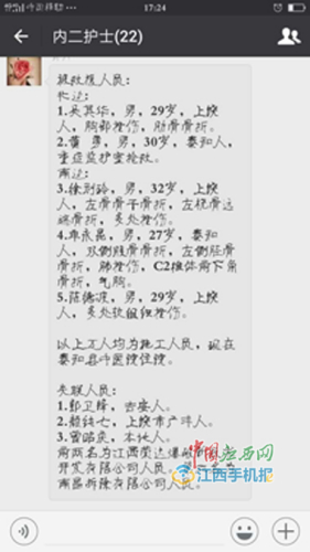 已獲救人員名單:橋北邊:1。吳其華,男,29歲,上饒人,胸部挫傷,肋骨骨折。2。黃 勇,男,30歲,泰和人,重癥監(jiān)護(hù)室搶救。