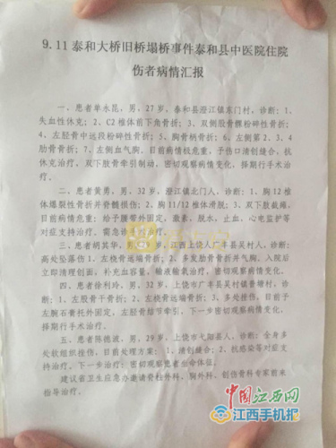 橋南邊:3。徐利玲,男,32歲,上饒人,左骨骨干骨折,左橈骨遠(yuǎn)端骨折,多處挫傷。4。單永昆,男,27歲,泰和人,雙側(cè)股骨骨折,左側(cè)脛骨骨折,肺挫傷,C2椎體前下角骨折,氣胸。5。陳德波,男,29歲,上饒人,多處軟組織挫傷。