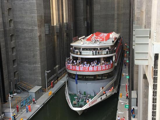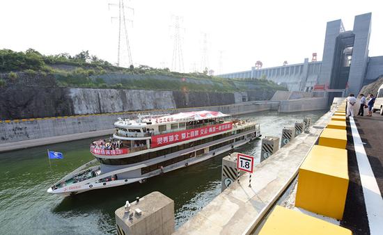 9月18日,“長(zhǎng)江三峽9號(hào)”游輪駛離升船機(jī)進(jìn)入下游引航道。新華社記者 程敏 攝