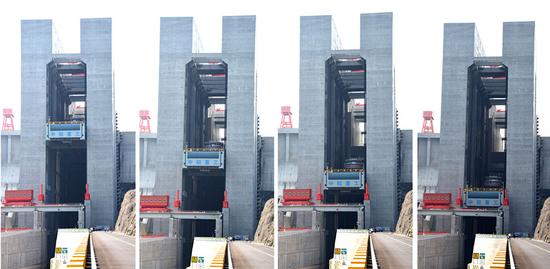 從左至右為升船機(jī)的承船廂從上降下(拼版照片)。新華社記者 程敏 攝