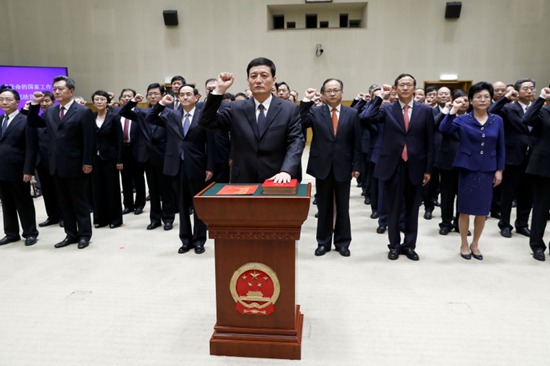 “我宣誓:忠于中華人民共和國憲法,維護(hù)憲法權(quán)威,履行法定職責(zé),忠于祖國、忠于人民,恪盡職守、廉潔奉公,接受人民監(jiān)督,為建設(shè)富強(qiáng)、民主、文明、和諧的社會主義國家努力奮斗!”