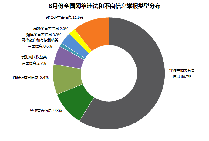 綜合分析全國舉報情況,淫穢色情類有害信息舉報仍較為突出,達(dá)142.5萬件,占比60.7%;政治類有害信息舉報占比11.9%;詐騙類有害信息舉報占比8.4%;侵犯網(wǎng)民權(quán)益類有害信息舉報占比2.7%;賭博類有害信息舉報占比3.9%;暴恐類有害信息舉報占比2.0%;網(wǎng)絡(luò)敲詐和有償刪帖類有害信息舉報占比0.6%;其他有害信息舉報占比9.8%。