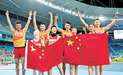 9月14日,里約殘奧會(huì)田徑女子4×100米T11—13級(jí)決賽,中國(guó)運(yùn)動(dòng)員奪得金牌后與領(lǐng)跑員一起慶祝。