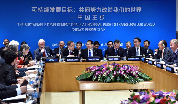 圖片說明:當(dāng)?shù)貢r間19日下午,李克強(qiáng)總理在聯(lián)合國總部主持“可持續(xù)發(fā)展目標(biāo):共同努力改造我們的世界——中國主張”座談會。