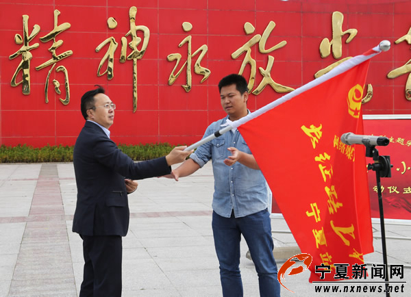 自治區(qū)黨委宣傳部副部長、網(wǎng)信辦主任徐賀向采訪團(tuán)授旗。