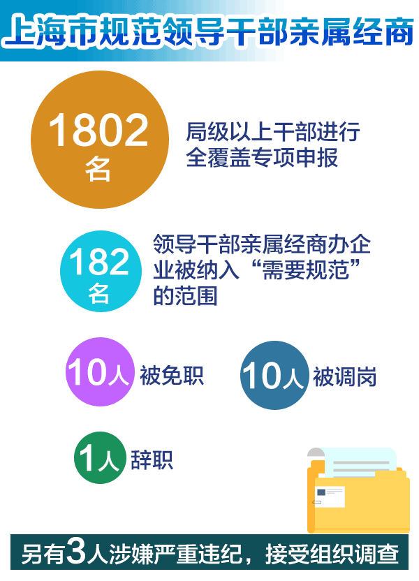 規(guī)范領(lǐng)導(dǎo)干部配偶、子女違規(guī)經(jīng)商,整治領(lǐng)導(dǎo)干部“身邊人腐敗”,群眾有期待,中央也早就盯上了。具體怎么做?去年2月,中央深改組第十次會議將試點(diǎn)首次選定在上海。試行一年來,上海嚴(yán)查領(lǐng)導(dǎo)干部親屬經(jīng)商辦企業(yè),共甄別出165名市管干部需要規(guī)范,目前已全部完成規(guī)范工作。其中,112人親屬退出經(jīng)商辦企業(yè)活動,10人調(diào)整現(xiàn)任職務(wù),10人免職退休,1人辭去現(xiàn)任職務(wù),另有3人被立案調(diào)查。
