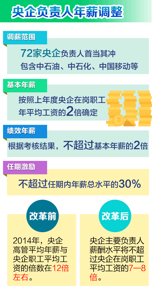 改革后,據(jù)人社部透露,從2015年1月開始,央企已全部按要求調(diào)整了企業(yè)負(fù)責(zé)人的基本年薪標(biāo)準(zhǔn)。多數(shù)中央管理企業(yè)負(fù)責(zé)人的薪酬水平下降,有的下降幅度還比較大。