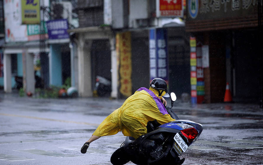 9月27日,花蓮,今年第17號(hào)臺(tái)風(fēng)“鲇魚”正逼近臺(tái)灣,根據(jù)臺(tái)氣象部門預(yù)測(cè),“鲇魚”暴風(fēng)圈27日清晨碰觸臺(tái)灣東部陸地,27日午后臺(tái)風(fēng)中心于花蓮、臺(tái)東交界處登陸,臺(tái)氣象部門今天下午上修15縣市風(fēng)力,雙北、中彰及云嘉南12級(jí),宜蘭14級(jí)、花蓮16級(jí)。圖為花蓮,一個(gè)騎摩托車的人被吹倒。