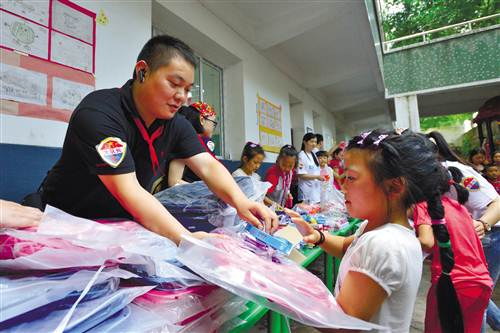 社會志愿者向?qū)W生贈送學(xué)習用品 攝/陳星宇