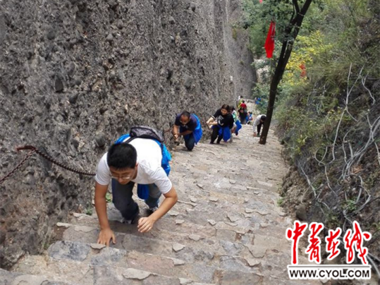 采訪團(tuán)成員手腳并用,攀登薛家寨