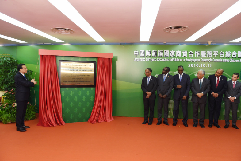開(kāi)幕式前,李克強(qiáng)同與會(huì)葡語(yǔ)國(guó)家領(lǐng)導(dǎo)人共同出席“中國(guó)與葡語(yǔ)國(guó)家商貿(mào)合作服務(wù)平臺(tái)綜合體”項(xiàng)目啟動(dòng)儀式,并為“平臺(tái)綜合體”項(xiàng)目揭牌。