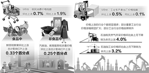 9月份CPI同比上漲1.9%,雖連續(xù)4個月處于“1時代”,但已比上月同比漲幅提高0.6個百分點,是連續(xù)4個月下降后的首次上漲。業(yè)內專家預計,四季度物價或小幅抬升,但幅度有限。同時,PPI同比上漲0.1%,4年半來首次由負轉正——