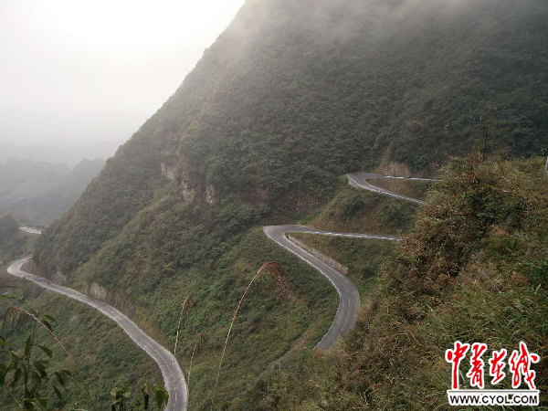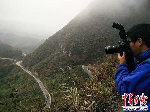 采訪團(tuán)成員在路邊拍攝“秀山45拐”