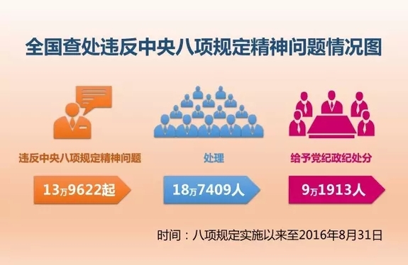 八項(xiàng)規(guī)定實(shí)施以來,截至2016年8月31日,全國已累計(jì)查處違反中央八項(xiàng)規(guī)定精神問題139622起、處理187409人,給予黨紀(jì)政紀(jì)處分91913人。