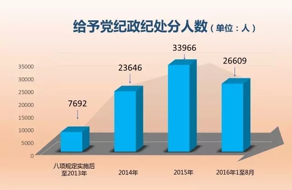 八項(xiàng)規(guī)定實(shí)施后至2013年末,全國共給予黨紀(jì)政紀(jì)處分7692人。2014年處分23646人,增2倍。2015年處分33966人,較上一年增長44%。2016年1至8月處分26609人,已超過2014年全年總數(shù)。數(shù)據(jù)變化的背后體現(xiàn)了紀(jì)檢監(jiān)察機(jī)關(guān)加大查處力度,越往后執(zhí)紀(jì)越嚴(yán)的要求。