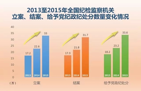 從十八屆中央紀(jì)委三次、五次、六次全會(huì)報(bào)告公布的數(shù)據(jù)看,2013年,全國紀(jì)檢監(jiān)察機(jī)關(guān)共立案17.2萬件,結(jié)案17.3萬件,給予黨紀(jì)政紀(jì)處分18.2萬人。2014年,全國紀(jì)檢監(jiān)察機(jī)關(guān)共立案22.6萬件,結(jié)案21.8萬件,給予黨紀(jì)政紀(jì)處分23.2萬人。2015年,全國紀(jì)檢監(jiān)察機(jī)關(guān)共立案33萬件,結(jié)案31.7萬件,給予黨紀(jì)政紀(jì)處分33.6萬人。據(jù)日前中央紀(jì)委通報(bào)的2016年前三季度全國紀(jì)檢監(jiān)察機(jī)關(guān)紀(jì)律審查數(shù)據(jù),2016年1—9月,全國紀(jì)檢監(jiān)察機(jī)關(guān)立案29萬件,處分26萬人。