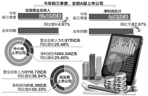 而據(jù)東方財(cái)富Choice數(shù)據(jù)統(tǒng)計(jì),今年前3季度,全部A股上市公司實(shí)現(xiàn)營(yíng)業(yè)總收入22.44萬(wàn)億元,同比增長(zhǎng)4.87%;凈利潤(rùn)合計(jì)為2.08萬(wàn)億元,同比下滑2.97%。中小板上市公司今年前3季度的營(yíng)業(yè)總收入為1.97萬(wàn)億元,同比增長(zhǎng)20.48%;凈利潤(rùn)為1494.04億元,同比增幅為25.60%。創(chuàng)業(yè)板上市公司今年前3季度實(shí)現(xiàn)營(yíng)業(yè)收入5110.72億元,同比增長(zhǎng)36.94%;凈利潤(rùn)為618.39億元,同比增長(zhǎng)50.33%。