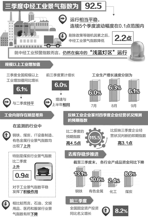 由經(jīng)濟(jì)日報社中國經(jīng)濟(jì)趨勢研究院、國家統(tǒng)計局中國經(jīng)濟(jì)景氣監(jiān)測中心、中國社科院數(shù)量經(jīng)濟(jì)與技術(shù)經(jīng)濟(jì)研究所共同編制的2016年三季度中經(jīng)產(chǎn)業(yè)景氣指數(shù)今日發(fā)布。中經(jīng)產(chǎn)業(yè)景氣指數(shù)所采集的行業(yè)涵蓋了工業(yè)領(lǐng)域的重點產(chǎn)業(yè),包括裝備制造、煤炭、石油、電力、鋼鐵、有色金屬、化工、IT設(shè)備制造、醫(yī)藥、服裝、文體娛樂用品等。本期報告重點分析今年三季度上述行業(yè)的運行情況和特點,并對今年四季度和明年一季度的發(fā)展趨勢進(jìn)行預(yù)測——