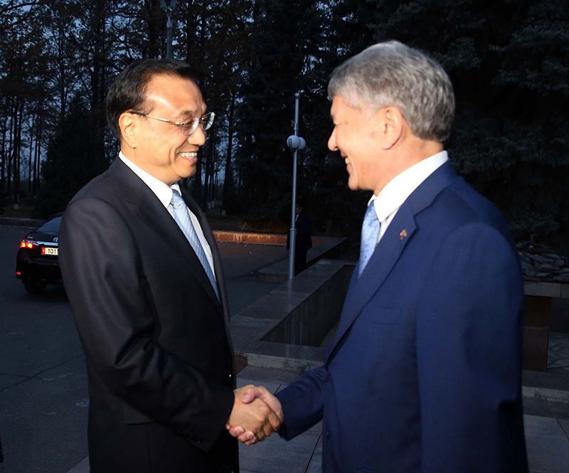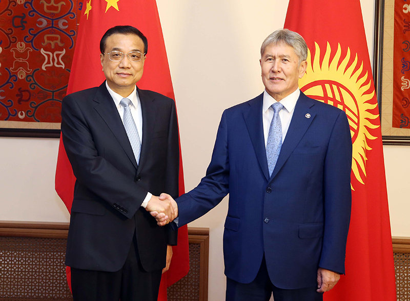 國(guó)務(wù)院總理李克強(qiáng)當(dāng)?shù)貢r(shí)間2日晚在比什凱克總統(tǒng)官邸會(huì)見(jiàn)吉爾吉斯斯坦總統(tǒng)阿坦巴耶夫。