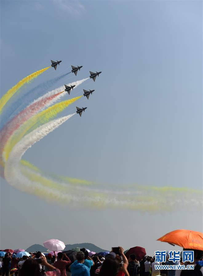 11月6日,觀(guān)眾在航展現(xiàn)場(chǎng)觀(guān)看飛行表演。當(dāng)日,在廣東珠海舉行的第十一屆中國(guó)國(guó)際航空航天博覽會(huì)落下帷幕。 新華社記者賈宇辰攝