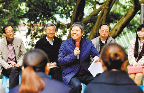 11月3日,渝北區(qū)臨港路社區(qū),劉文長(中)正在給社區(qū)居民宣講與人相處的禮儀之道。
