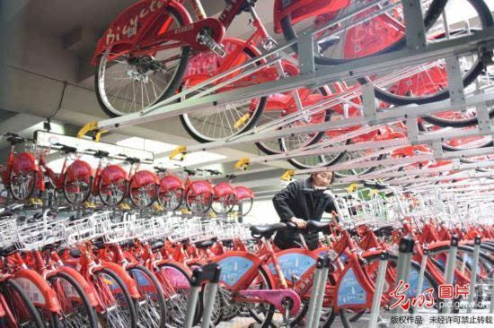 當(dāng)日,杭州首個公共自行車立體停車裝置在位于杭州東站東廣場下的公共自行車閘機(jī)式服務(wù)點投入試用。該裝置分上下兩層,由一排豎立支架和數(shù)十個可滑動的獨立停車托架組成,將自行車推入托架后即可輕松地移送至上層停放,上層停滿后再停放下層,同樣的占地面積能提高一倍的儲車量,有效緩解人們租不到車或停不進(jìn)車的尷尬,特別適合設(shè)置在人流密集、租車需求量較大的地段。(朱引煒攝/光明圖片)