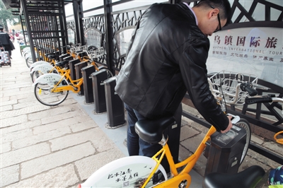 2015年12月8日,浙江烏鎮(zhèn),一位游客正在通過(guò)掃描二維碼,租賃自行車。新京報(bào)記者 李冬 攝