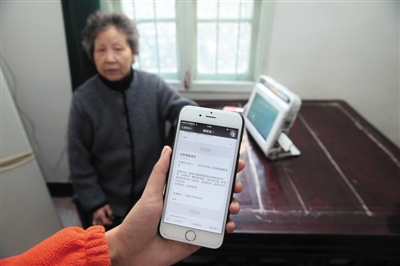 2015年12月8日,烏鎮(zhèn)獨(dú)居老人楊麗娟在家中使用帶有網(wǎng)絡(luò)功能的儀器測(cè)量血壓。新京報(bào)記者 李冬 攝