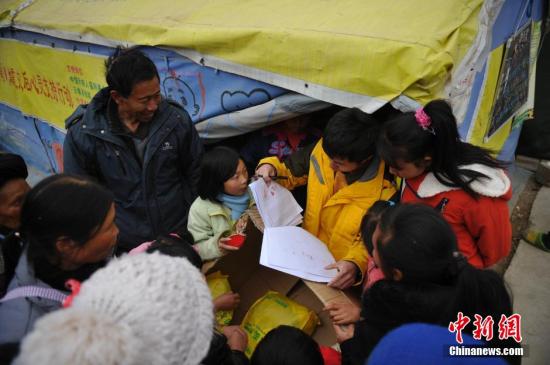 資料圖:2015年2月7日,云南魯?shù)辇堫^山鎮(zhèn),社工向安置點民眾發(fā)放溫暖包。中新社發(fā) 劉冉陽 攝