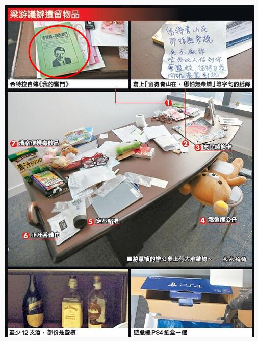 梁頌恒游蕙禎辦公室有多個酒瓶、納粹書籍、零食等