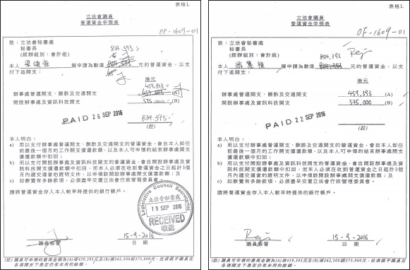 根據(jù)秘書處回覆記錄,梁頌恆、游蕙禎已各自領(lǐng)取了的95,180元月薪,更申領(lǐng)預(yù)支834,393元營運資金,兩人合共領(lǐng)取近186萬港元。值得一提的是,記者昨日查閱了兩人的營運資金申報表,發(fā)現(xiàn)兩人申報時先寫了834,353元,比上限少40元,但其后改成834,393元,連40元都要拿盡。