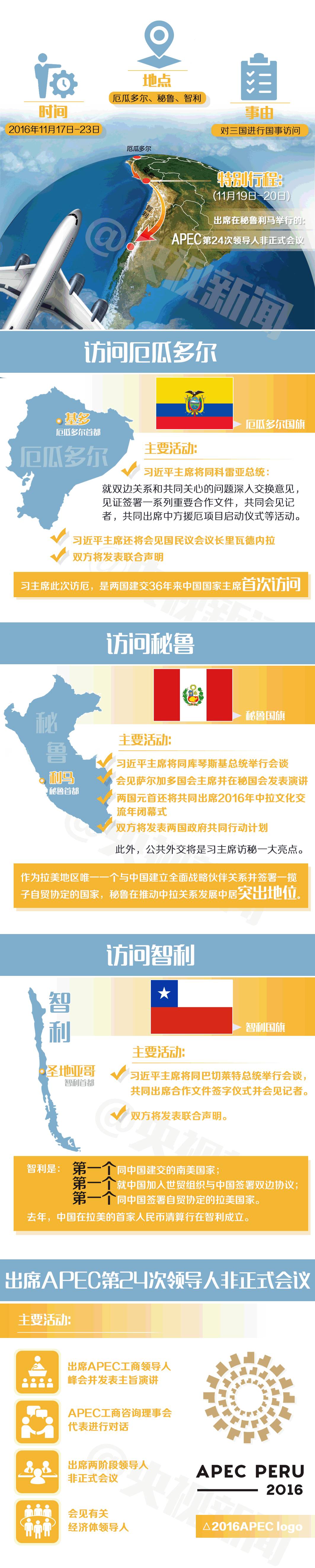 11月16日,國(guó)家主席習(xí)近平乘專機(jī)離開(kāi)北京,對(duì)厄瓜多爾、秘魯、智利進(jìn)行國(guó)事訪問(wèn)并出席在秘魯利馬舉行的亞太經(jīng)合組織第二十四次領(lǐng)導(dǎo)人非正式會(huì)議。這是習(xí)主席第三次訪問(wèn)拉美國(guó)家。