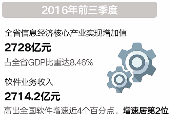 2016年前三季度,全省信息經(jīng)濟核心產(chǎn)業(yè)實現(xiàn)增加值2728億元,同比增長14.1%,比去年同期提高0.9個百分點,比全省GDP增幅高6.6個百分點,占全省GDP比重達8.46%,比去年同期提高0.92個百分點;規(guī)上信息經(jīng)濟核心產(chǎn)業(yè)實現(xiàn)主營業(yè)務收入7997.9億元、利稅總額1349.0億元、利潤總額1107.8億元,分別增長17.2%、25.8%和28.9%;實現(xiàn)軟件業(yè)務收入2714.2億元,同比增長18.5%,高出全國軟件增速近4個百分點,增速居第2位。