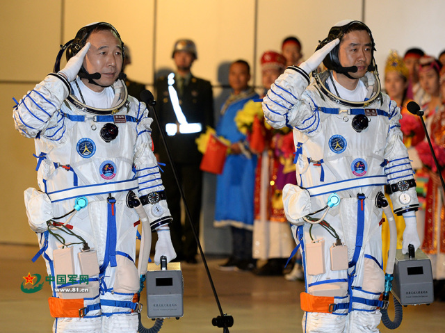 航天員景海鵬(左)、陳冬在出征儀式上敬禮。中國軍網(wǎng)記者 岱天榮攝