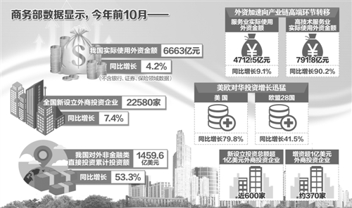 全球貿(mào)易增速放緩,中國引資“答卷”亮點依舊。11月17日,商務部發(fā)布最新數(shù)據(jù)顯示,今年前10月,不含銀行、證券、保險領域數(shù)據(jù),我國實際使用外資金額6663億元,同比增長4.2%;全國新設立外商投資企業(yè)22580家,同比增長7.4%;我國對外非金融類直接投資累計投資額1459.6億美元,同比增長53.3%。
