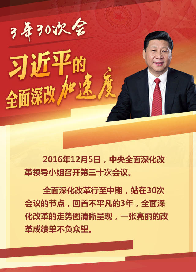 2016年12月5日,中央全面深化改革領(lǐng)導(dǎo)小組召開第三十次會(huì)議。全面深化改革啟動(dòng)3年來,在習(xí)近平總書記直接領(lǐng)導(dǎo)下,中央深改組的30次會(huì)議,牢牢把握改革正確方向,及時(shí)提出階段性任務(wù)目標(biāo),著眼全局性重大問題進(jìn)行頂層設(shè)計(jì),審議通過198份改革文件,狠抓改革舉措落地,直面問題點(diǎn)穴開方……