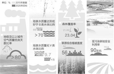 規(guī)劃提出約束性和預(yù)期性指標(biāo),其中約束性指標(biāo)12項(xiàng),分別是地級(jí)及以上城市空氣質(zhì)量?jī)?yōu)良天數(shù)比率、細(xì)顆粒物未達(dá)標(biāo)地級(jí)及以上城市濃度下降、地表水質(zhì)量達(dá)到或好于Ⅲ類水體比例、地表水質(zhì)量劣Ⅴ類水體比例、森林覆蓋率、森林蓄積量、受污染耕地安全利用率、污染地塊安全利用率,以及化學(xué)需氧量、氨氮、二氧化硫、氮氧化物污染物排放總量減少。